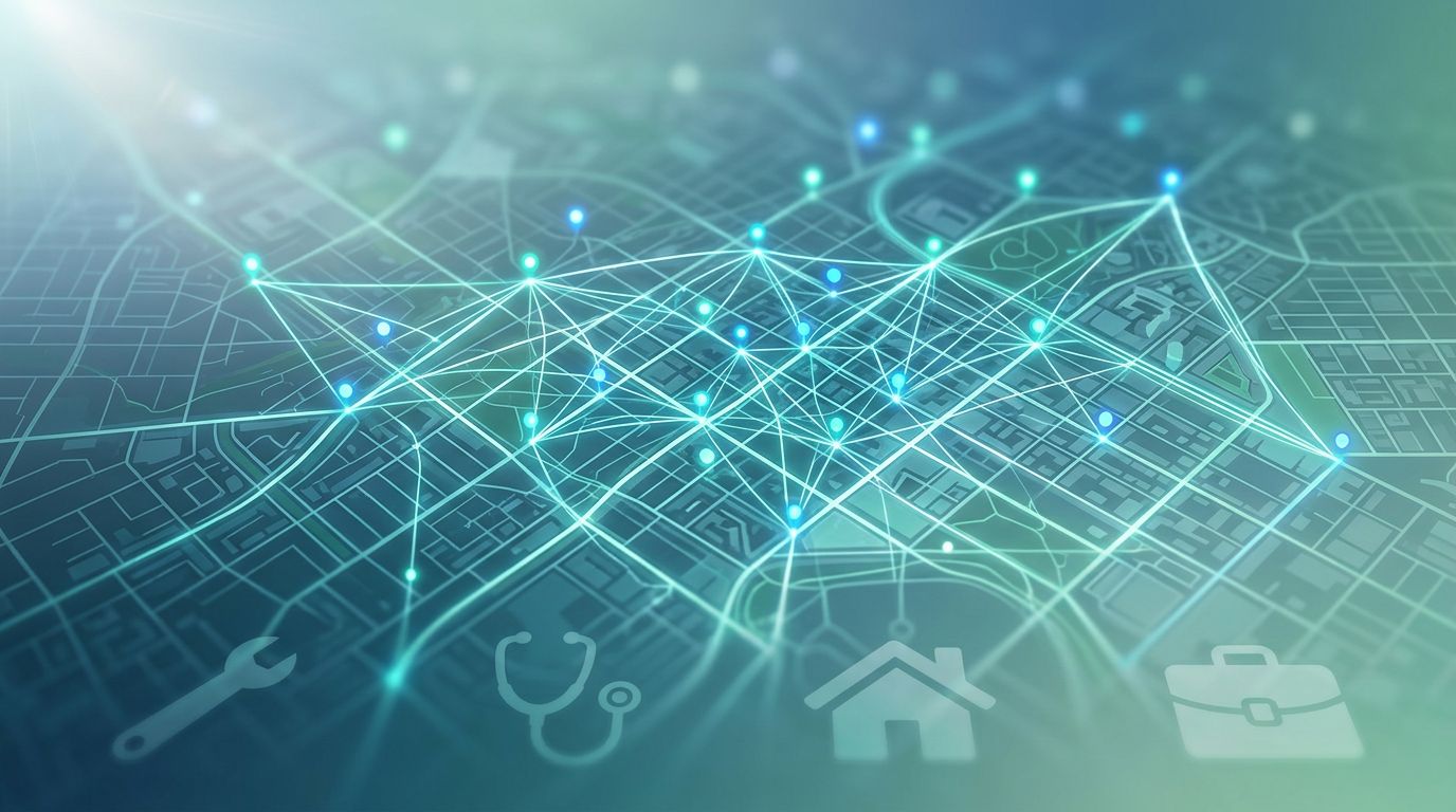 Clean modern illustration of interconnected website pages forming a local map with pins for service areas like plumbing and HVAC services, arrows indicating internal links between service pages, city pages, and blog posts.